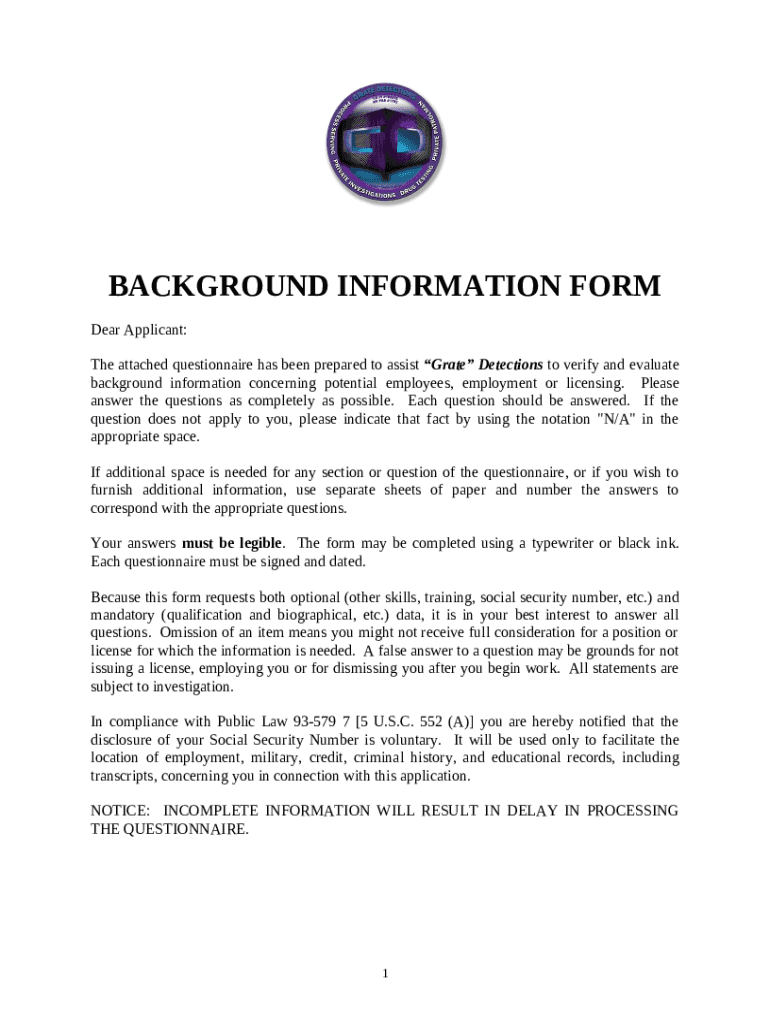 TAG Pre-Employment Personal History Statement. Pre-Employment Background Investigation template instructions