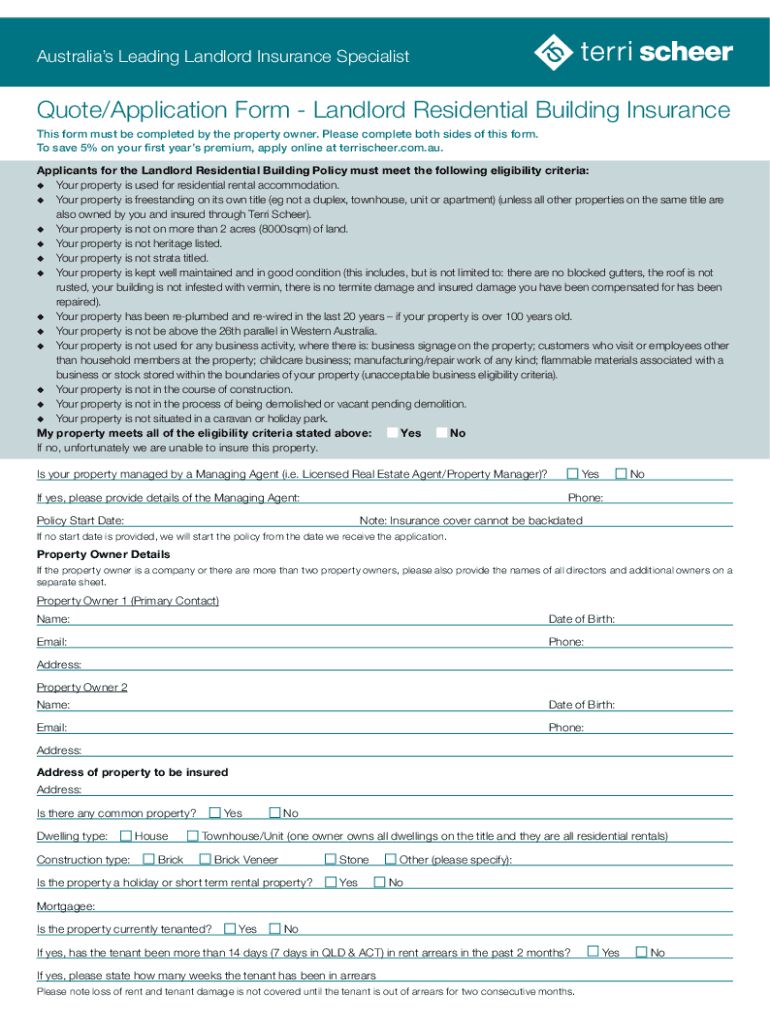 Australia's Leading Landlord Insurance SpecialistQuote/Application Form Landlord Residential Building Insurance This form must be completed by the property owner. Please complete both sides of this