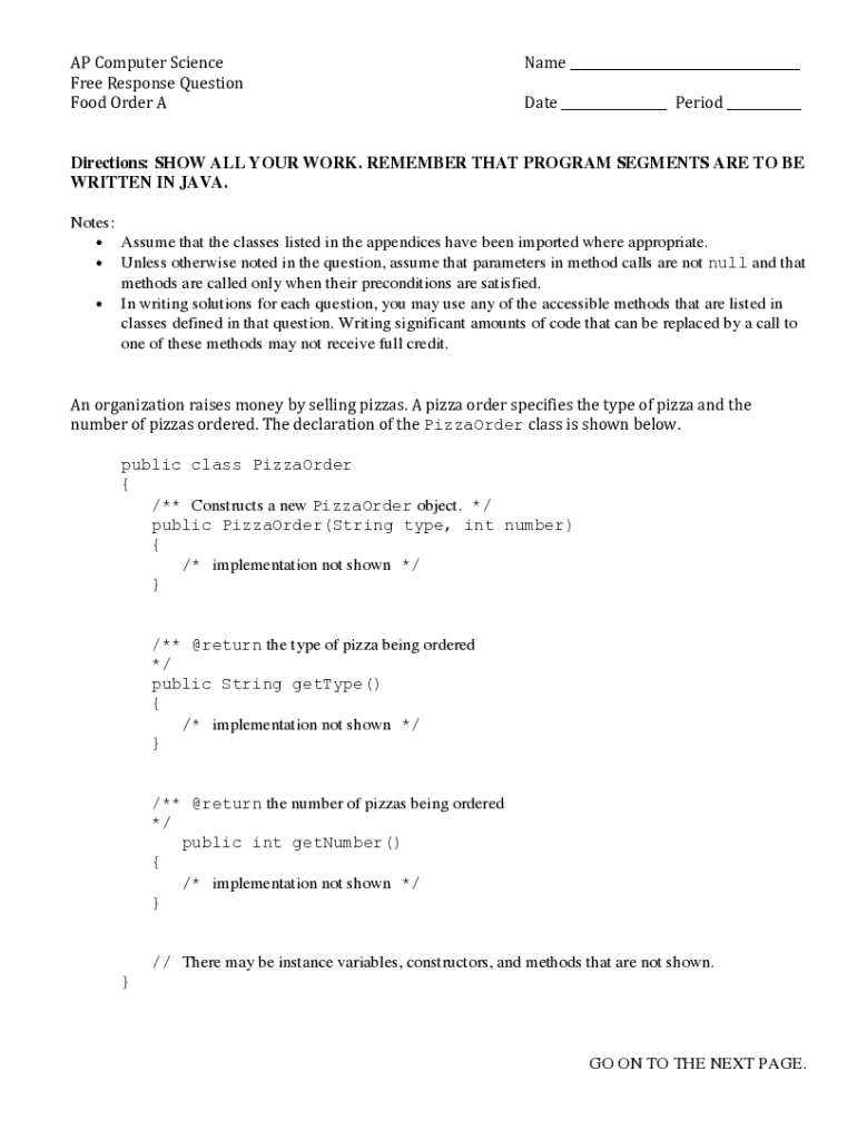 AP Computer ScienceFree Response Questioned Order Name ___Date ___Period ___Directions: SHOW ALL YOUR WORK. REMEMBER THAT PROGRAM SEGMENTS ARE TO BE