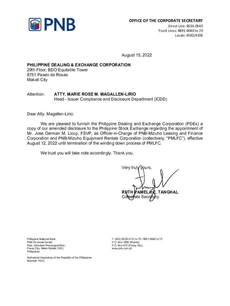 OFFICE OF THE CORPORATE SECRETARY Direct Line: 85360540 Trunk Lines: 88916040 to 70 Locals: 4582/4106August 15, 2022 PHILIPPINE DEALING & EXCHANGE CORPORATION 29th Floor, BDO Equitable Tower 8751