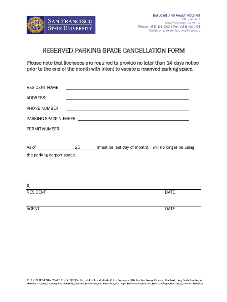 EMPLOYEE AND FAMILY HOUSING 800 Font Blvd. San Francisco, CA 94132 Phone: (415) 4054000 | Fax: (415) 4064105 Email: employee_housing@sfsu.eduRESERVED PARKING SPACE CANCELLATION FORM Please note that