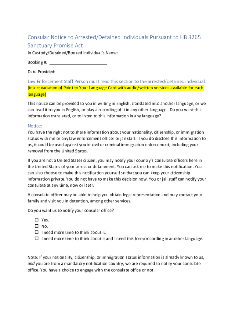 Consular Notice to Arrested/Detained Individuals Pursuant to HE 3265 Sanctuary Promise Act In Custody/Detained/Booked Individuals Name: ___ Booking #: ___ Date Provided: ___Law Enforcement Staff Person