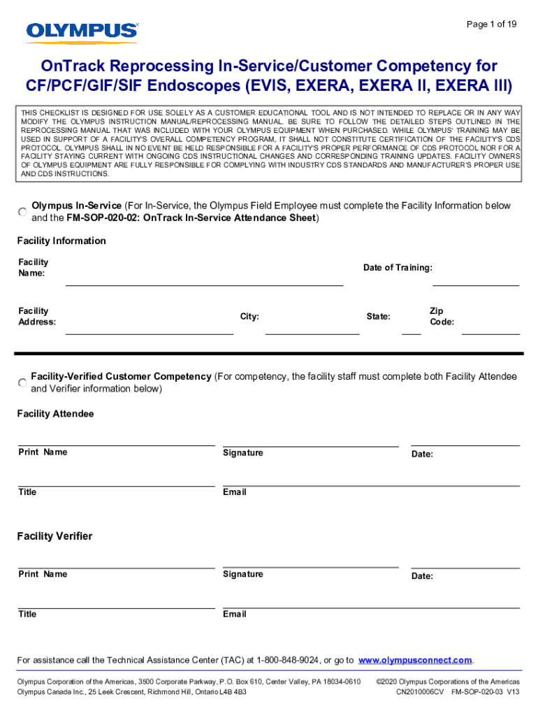 Page 1 of 19OnTrack Reprocessing In-service/Customer Competency for CF/PCF/GIF/IF Endoscopes (EVIL, EXTRA, EXTRA II, EXTRA III) THIS CHECKLIST IS DESIGNED FOR USE SOLELY AS A CUSTOMER EDUCATIONAL