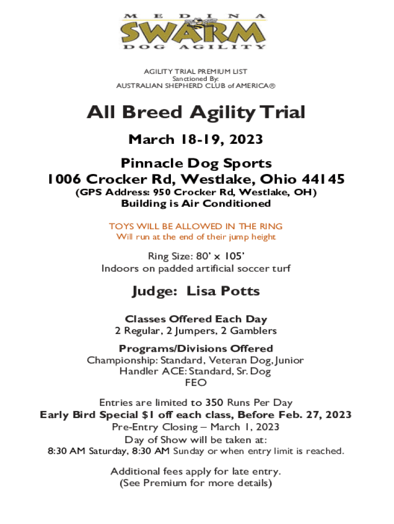 AGILITY TRIAL PREMIUM LIST Sanctioned By: AUSTRALIAN SHEPHERD CLUB of American Breed Agility Trial March 1819, 2023 Pinnacle Dog Sports 1006 Crocker Rd, Westlake, Ohio 44145 (GPS Address: 950 Crocker