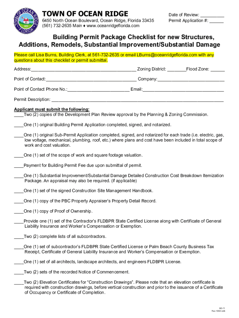TOWN OF OCEAN RIDGE6450 North Ocean Boulevard, Ocean Ridge, Florida 33435 (561) 7322635 Main www.oceanridgeflorida.comDate of Review: ___ Permit Application #: ___Building Permit Package Checklist