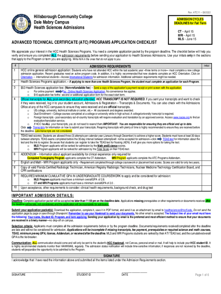 Rev. ATC11 09/2022Hillsborough Community College Dale Mary Campus Health Sciences AdmissionsADMISSION CYCLES DEADLINES for Fall Term CT April 15 MRI April 15 MLS June 15ADVANCED TECHNICAL CERTIFICATE