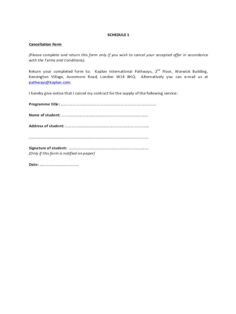 SCHEDULE1 CancellationForm (Pleasecompleteandreturnthisformonlyifyouwishtocancelyouracceptedofferinaccordance withtheTermsandConditions). Return your completed form to: Kaplan International Pathways,