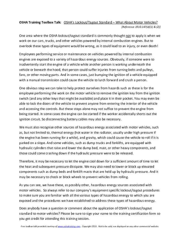 Get the free OSHA Training Toolbox Talk: OSHA's Lockout/Tagout Standard ...