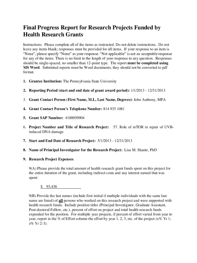 Final Progress Report for Research Projects Funded by Health Research Grants Instructions: Please complete all the items as instructed. Do not delete instructions. Do not leave any items blank; responses