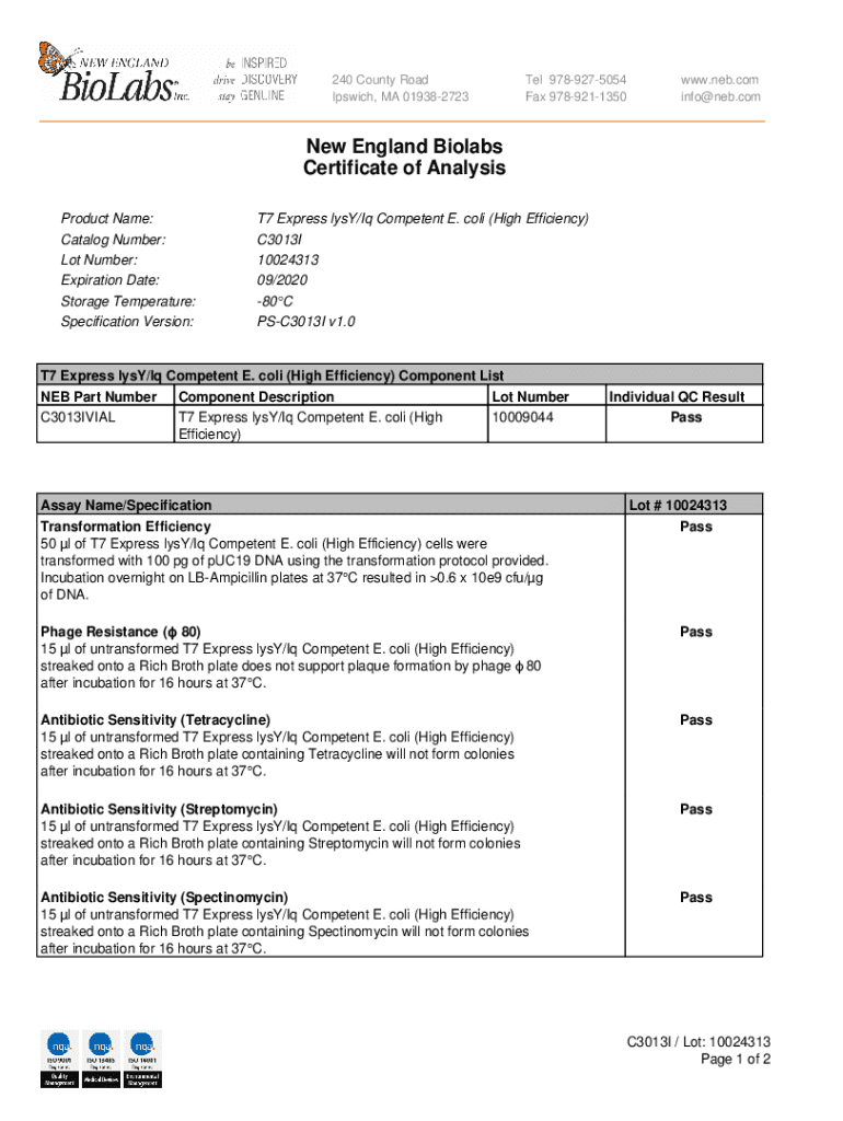 240 County Road Ipswich, MA 019382723Tel 9789275054 Fax 9789211350www.neb.com info@neb.comNew England Biol abs Certificate of Analysis Product Name: Catalog Number: Lot Number: Expiration Date: Storage