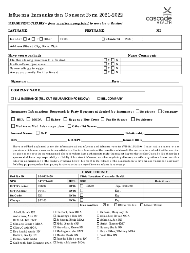 Influenza Immunization Consent Form 20212022 PLEASE PRINT CLEARLY form must be completed to receive a flu shot LAST NAME: Gender:FIRST NAME: MF DOB:Other MI: if under 18Ph#: ()Address (Street, City,
