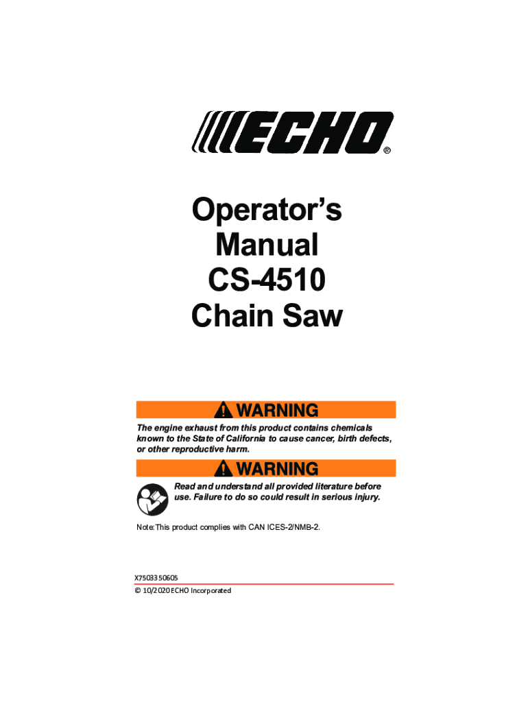 Operators Manual CS4510 Chain Swathe engine exhaust from this product contains chemicals known to the State of California to cause cancer, birth defects, or other reproductive harm. Read and understand