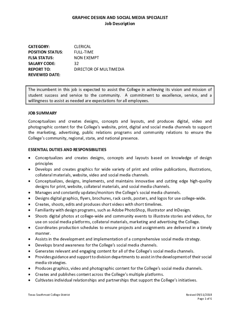 GRAPHIC DESIGN AND SOCIAL MEDIA SPECIALIST Job DescriptionCATEGORY: POSITION STATUS: FLEA STATUS: SALARY CODE: REPORT TO: REVIEWED DATE:CLERICAL FULL TIME NON-EXEMPT 32 Directors OF Multimedia incumbent
