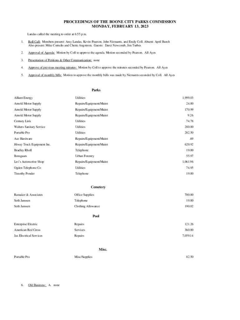 PROCEEDINGS OF THE BOONE CITY PARKS COMMISSION MONDAY, FEBRUARY 13, 2023, Lands called the meeting to order at 6:55 p.m. 1. Roll Call: Members present: Amy Lands, Kevin Pearson, John Caimans, and