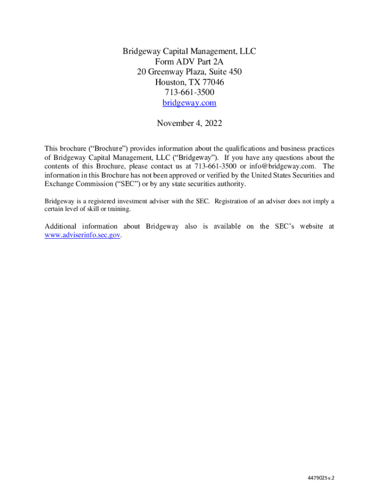 Bridleway Capital Management, LLC Form ADV Part 2A 20 Greenway Plaza, Suite 450 Houston, TX 77046 7136613500 bridgeway.com November 4, 2022, This brochure (Brochure) provides information about the
