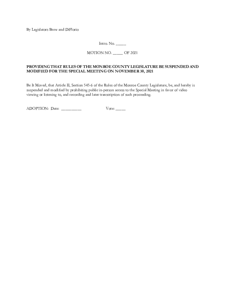 By Legislators Brew and DiCaprio Intro. No. ___ MOTION NO. ___ OF 2021 PROVIDING THAT RULES OF THE MONROE COUNTY LEGISLATURE BE SUSPENDED AND MODIFIED FOR THE SPECIAL MEETING ON NOVEMBER 30, 2021,