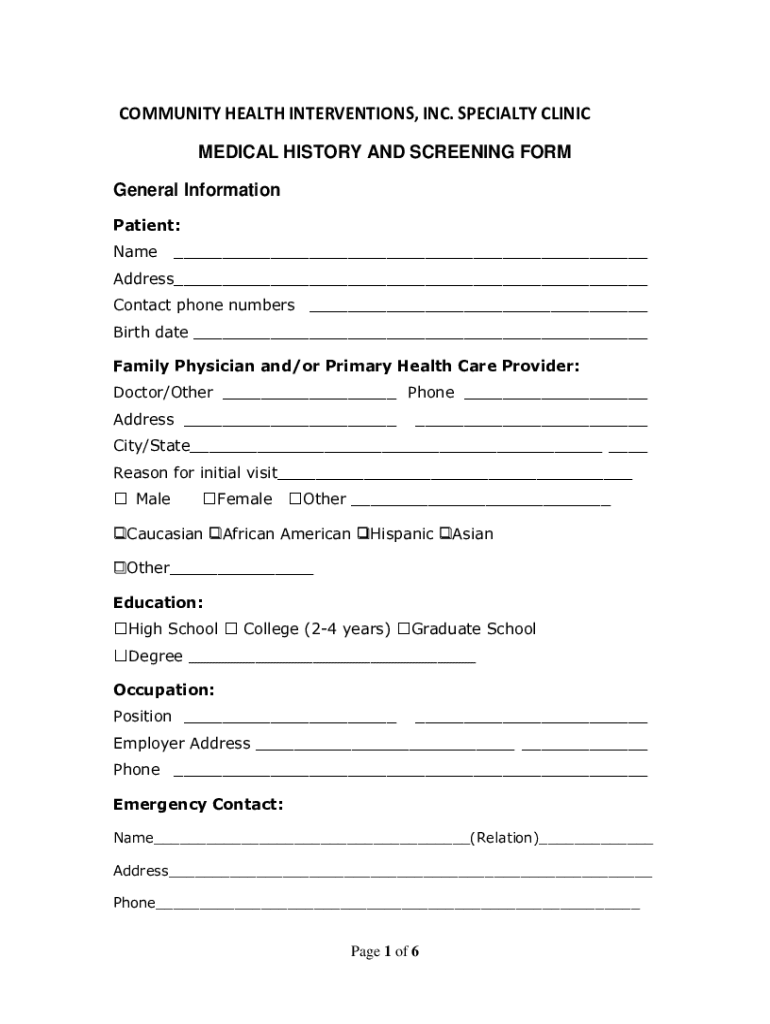 COMMUNITY HEALTH INTERVENTIONS, INC. SPECIALTY CLINIC MEDICAL HISTORY AND SCREENING FORM General Information Patient: Name___Address___ Contact phone numbers ___ Birth date ___ Family Physician and/or