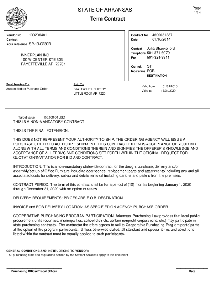 Page 1/14STATE OF ARKANSAS Term Contract Vendor No. Contact Your reference100206481Contract No. Date4600031387 01/10/2014SP130230RINNERPLAN INC 100 W CENTER STE 303 FAYETTEVILLE AR 72701Contact Telephone
