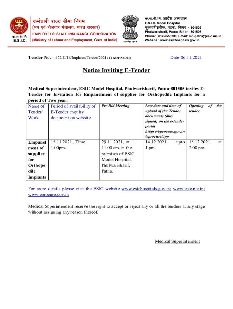 Tender No. 422U/16/Implants/Tender/2021 U/16/Implants/Tender/2021 (Tender No. 01)Date06.11.2021Notice Inviting EE Tender Medical Superintendent, ERIC Model Hospital, Phulwarisharif, Patna Patna801505