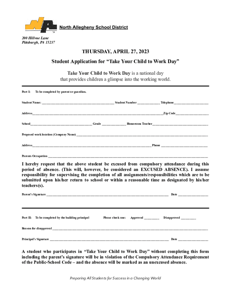 200 Hillview Lane Pittsburgh, PA 15237THURSDAY, APRIL 27, 2023, Student Application for Take Your Child to Work Day Take Your Child to Work Day is a national day that provides children a glimpse into