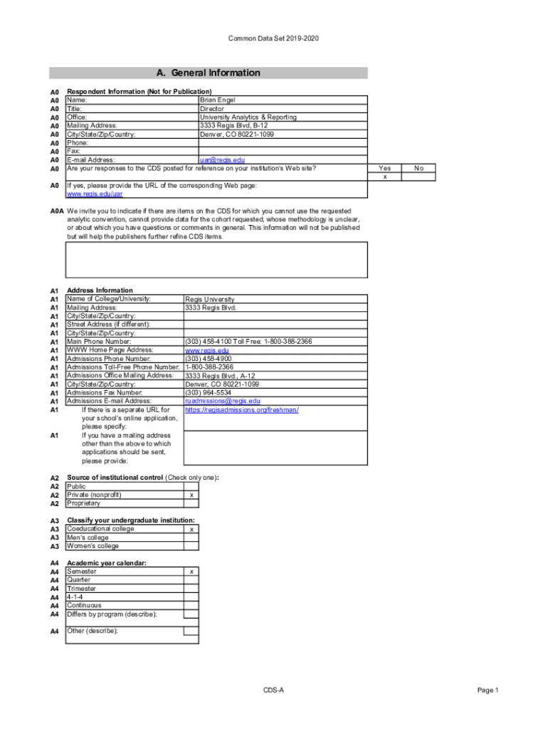 Common Data Set 20192020A. General Information A0 A0 A0 A0 A0 A0 A0 A0 A0 A0Respondent Information (Not for Publication) Name: Brian Angel Title: Director Office: University Analytics & Reporting