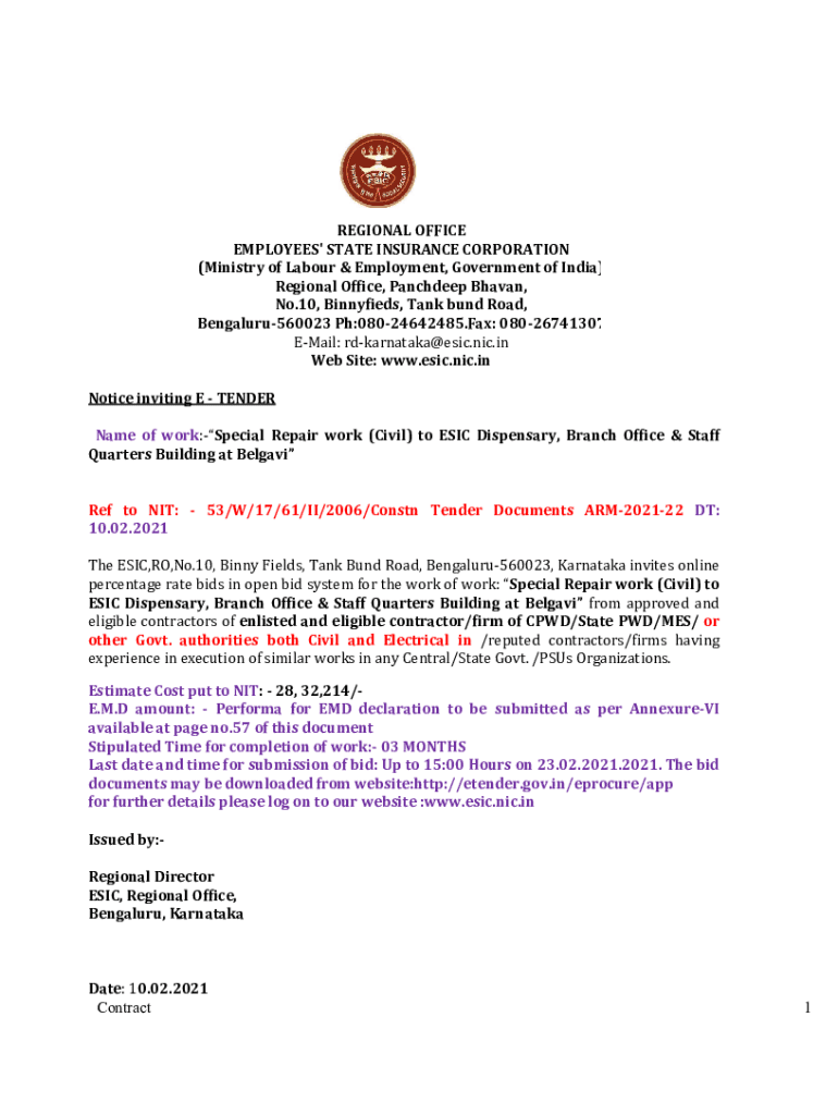 Get the free Name of work:-Special Repair work (Civil) to ESIC Dispensary, Branch Office & Staff
