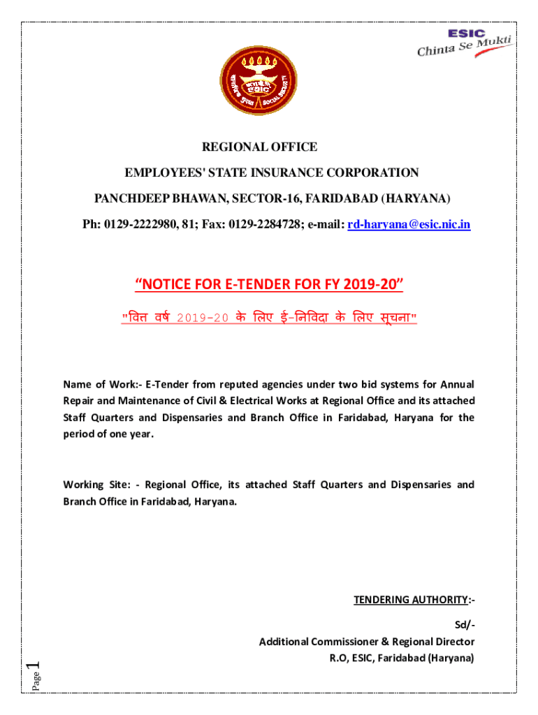 REGIONAL OFFICE EMPLOYEES\' STATE INSURANCE CORPORATION SANDEEP SHAWN, SECTOR16, FARIDABAD (HARYANA) pH: 01292222980, 81; Fax: 01292284728; email: rdharyana@esic.nic.inNOTICE FOR TENDER FOR FY 201920