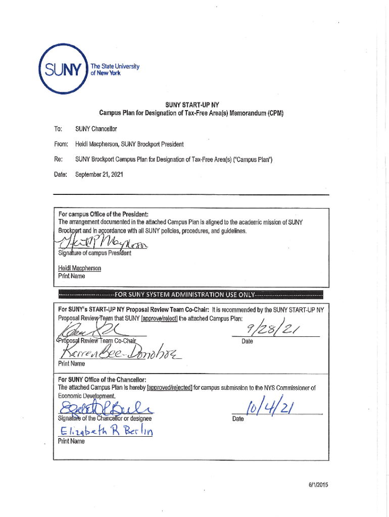 STARTUP NY AMENDED CAMPUS PLAN FOR DESIGNATION OF THREE AREA(S) Date: Campus Name: Campus Contact Name: Campus Contact Title: Campus Contact Email: Campus Contact Phone:August 17, 2021, SUN Brock
