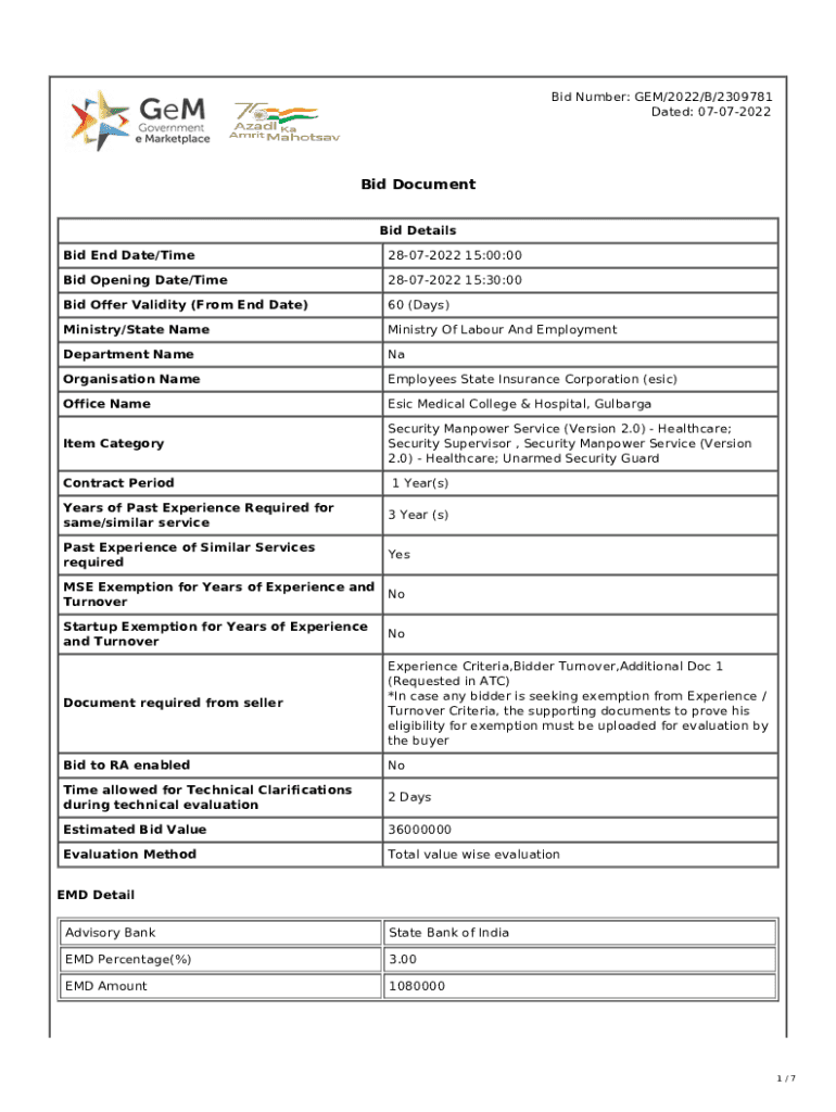 Bid Number: GEM/2022/B/2309781 Dated: 07072022Bid Document Bid Details Bid End Date/Time28072022 15:00:00Bid Opening Date/Time28072022 15:30:00Bid Offer Validity (From End Date)60 (Days)Ministry/State