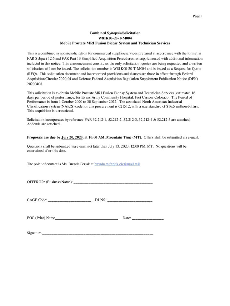 Page 1Combined Synopsis/Solicitation W81K0020TM004 Mobile Prostate MRI Fusion Biopsy System and Technician Services This is a combined synopsis/solicitation for commercial supplies/services prepared