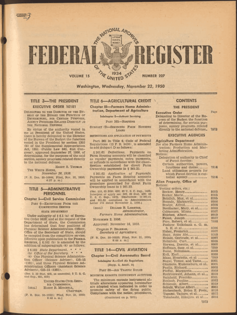 ^*volume 15NUMBER 227Washington, Wednesday, November 22, 950TITLE 3 THE PRESIDENTIAL 6 AGRICULTURAL CREDITCONTENTSEXECUTIVE ORDER 10181Chapter III Farmers Home Administration, Department of Agriculture