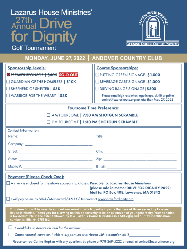 27thMONDAY, JUNE 27, 2022 | ANDOVER COUNTRY CLUB PREMIER SPONSOR | $40KSpecial recognition from our Executive Director at the Lunch and Dinner Programs Corporate branding on tee box, driving range,