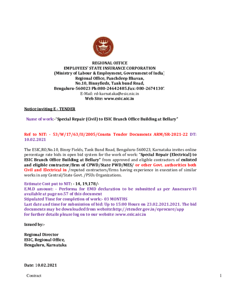 Get the free Name of work:-Special Repair (Civil) to ESIC Branch Office Building at Bellary
