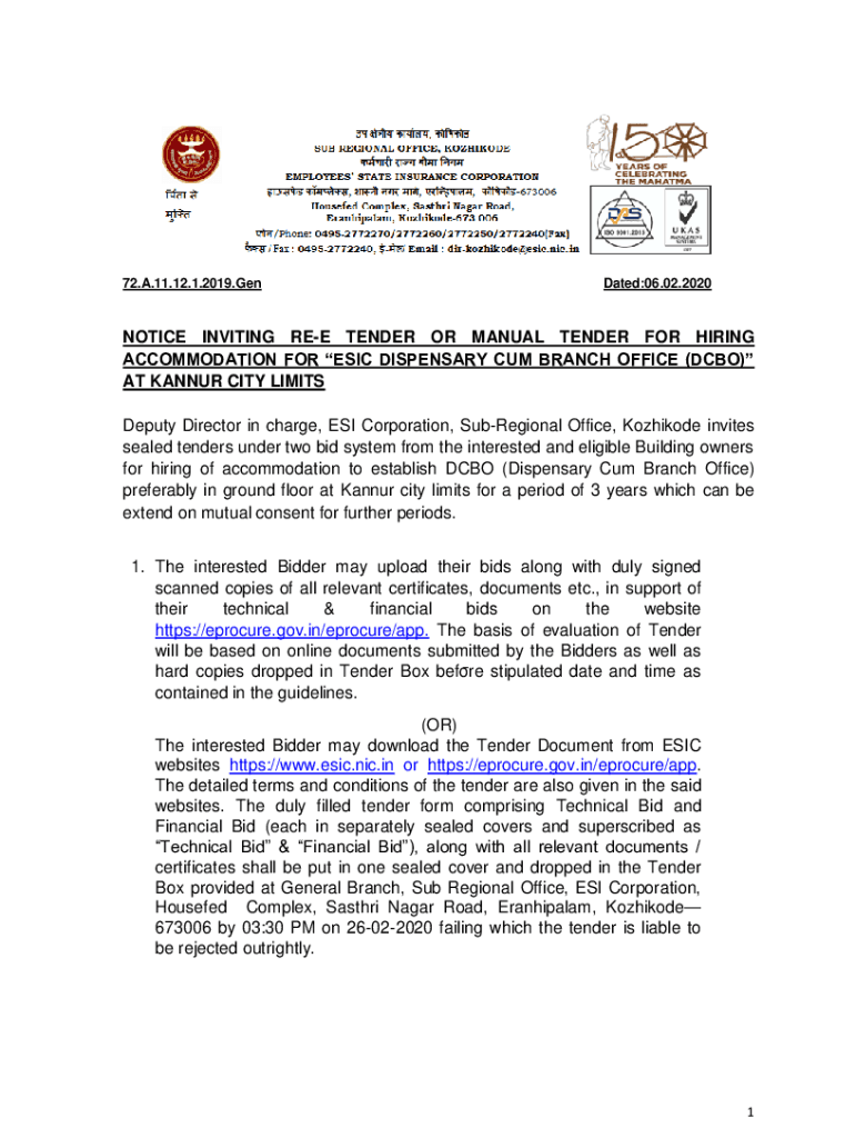 72. A.11.12.1.2019. Generated:06.02.2020NOTICE INVITING FREE TENDER OR MANUAL TENDER FOR HIRING ACCOMMODATION FOR ERIC DISPENSARY Come BRANCH OFFICE (CBO) AT KANPUR CITY LIMITS Deputy Director in