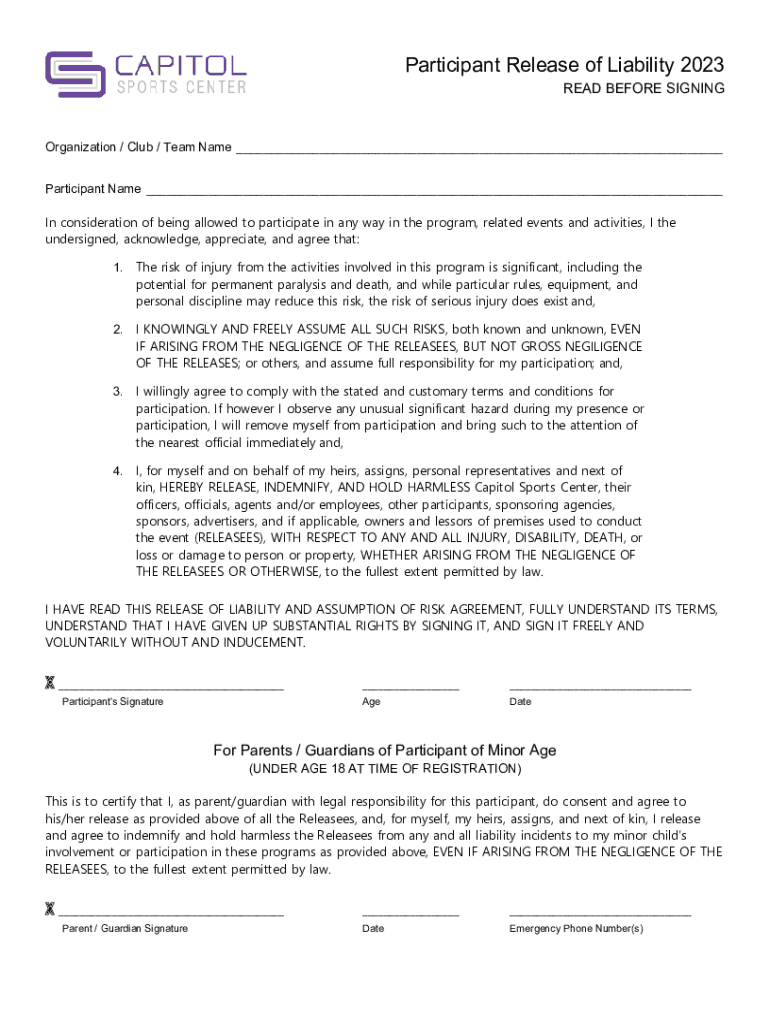 Participant Release of Liability 2023 READ BEFORE SIGNINGOrganization / Club / Team Name ___ Participant Name ___ In consideration of being allowed to participate in any way in the program, related