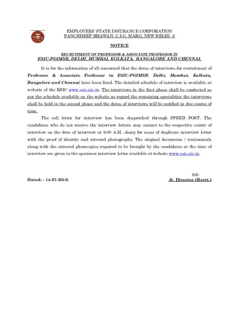 RECRUITMENT OF PROFESSOR & ASSOCIATE PROFESSOR INESICPGIMSR, DELHI, MUMBAI, KOLKATA, BANGALORE AND CHENNAI.