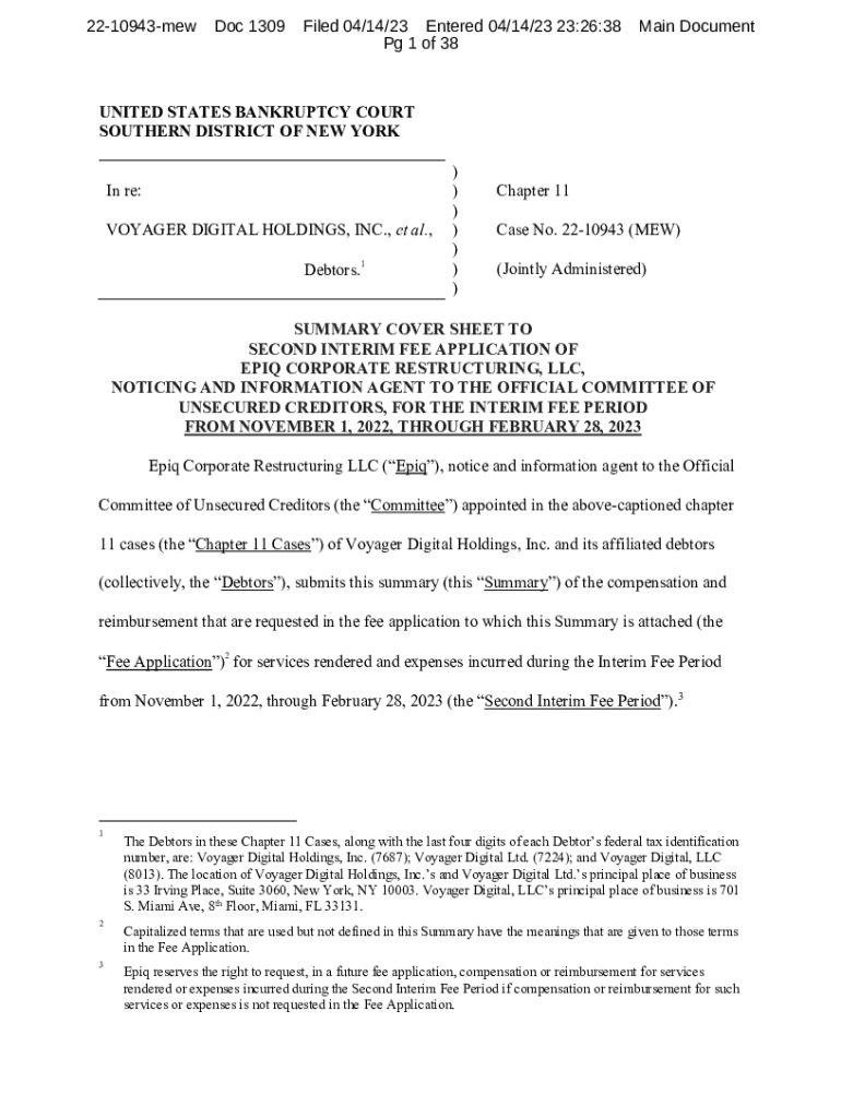 2210943mewDoc 1309Filed 04/14/23 Entered 04/14/23 23:26:38 Pg 1 of 38Main DocumentUNITED STATES BANKRUPTCY COURT SOUTHERN DISTRICT OF NEW YORK In re: VOYAGER DIGITAL HOLDINGS, INC., et al., 1Debtors.)