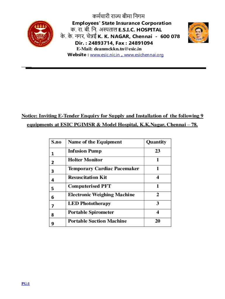 Employees\' State Insurance Corporation. . . . E.S.I.C. HOSPITAL. . , K. K. NAGAR, Chennai 600 078 Dir. 24893714, Fax : 24891094 Email: deanmckkn.tn@esic.in Website : www.esic.nic.in, www.esichennai.orgNotice: