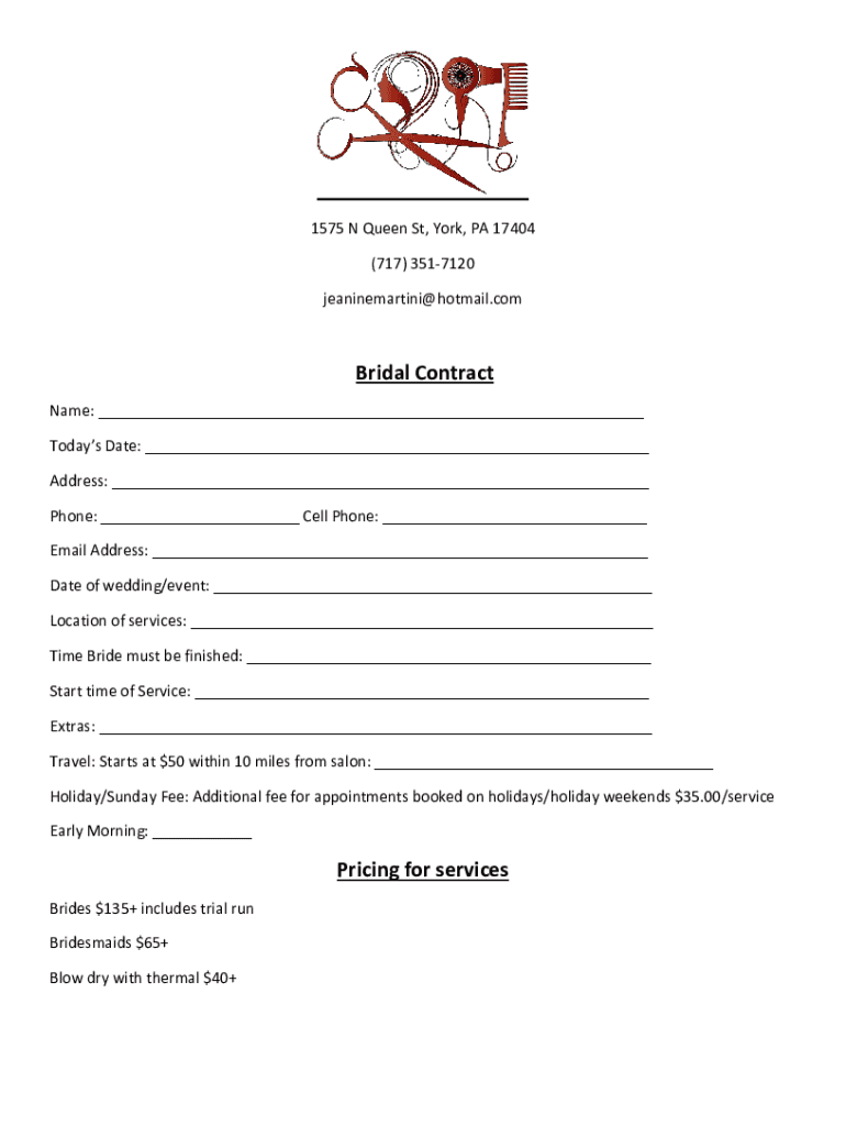 1575 N Queen St, York, PA 17404 (717) 3517120 jeaninemartini@hotmail.comBridal Contract Name: ___ Today's Date: ___ Address: ___ Phone: ___ Cell Phone: ___ Email Address: ___ Date of wedding/event: