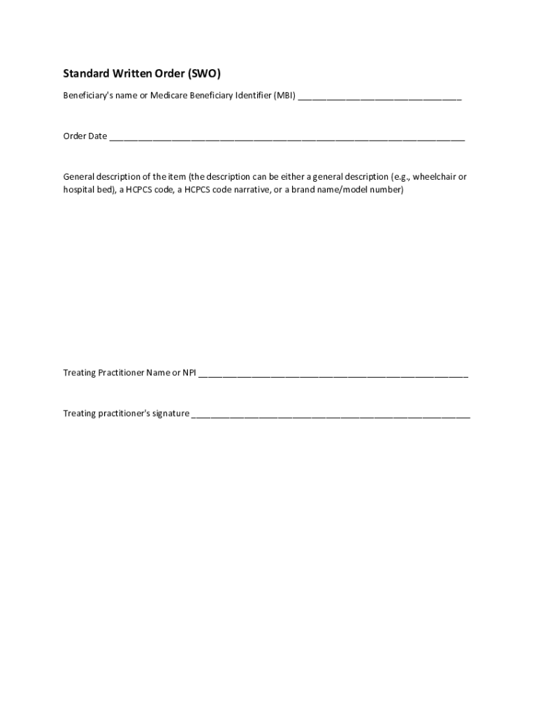 Standard Written Order (TWO) Beneficiary\'s name or Medicare Beneficiary Identifier (MBI) ___Order Date ___General description of the item (the description can be either a general description (e.g.,