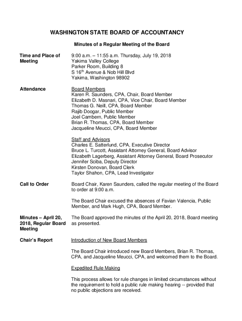 WASHINGTON STATE BOARD OF ACCOUNTANCY Minutes of a Regular Meeting of the Board Time and Place of Meeting9:00 a.m. 11:55 a.m. Thursday, July 19, 2018, Yakima Valley College Parker Room, Building 8