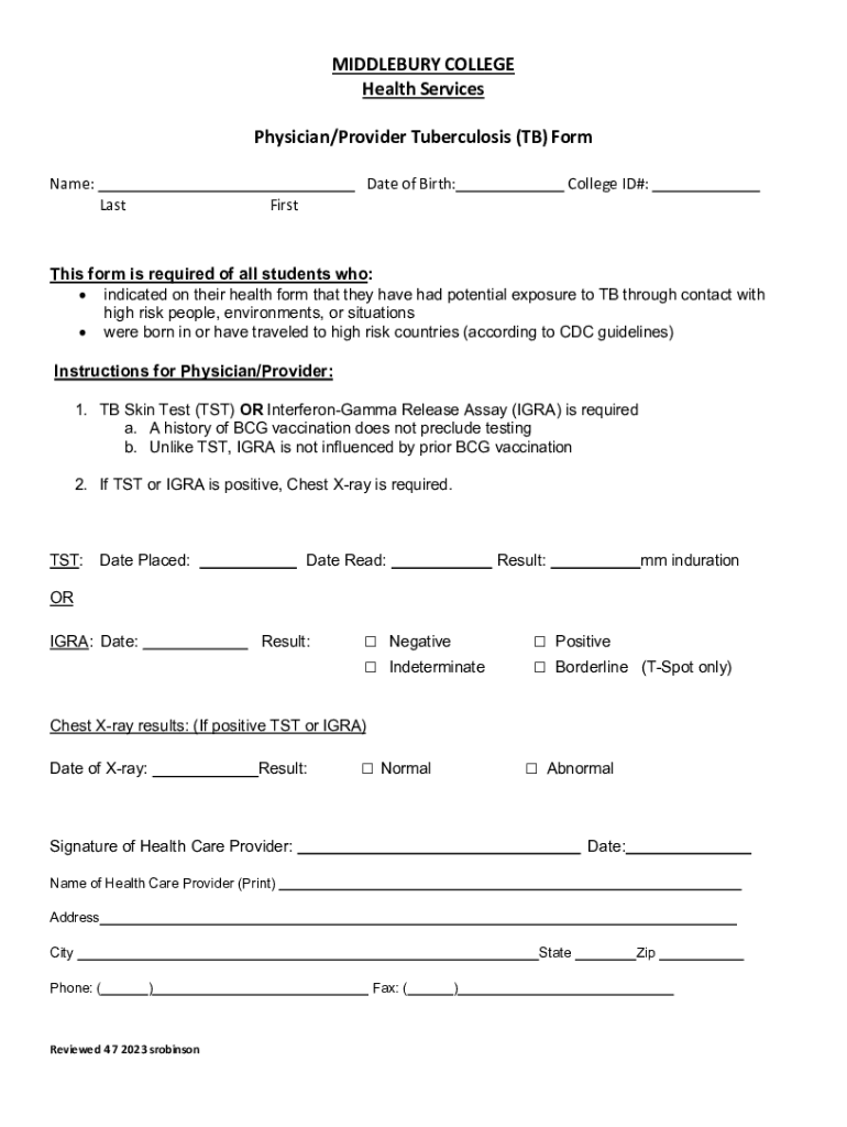 MIDDLEBURY COLLEGE Health Services Physician/Provider Tuberculosis (TB) Form Name:Lactate of Birth:FirstCollege ID#:This form is required of all students who: indicated on their health form that they