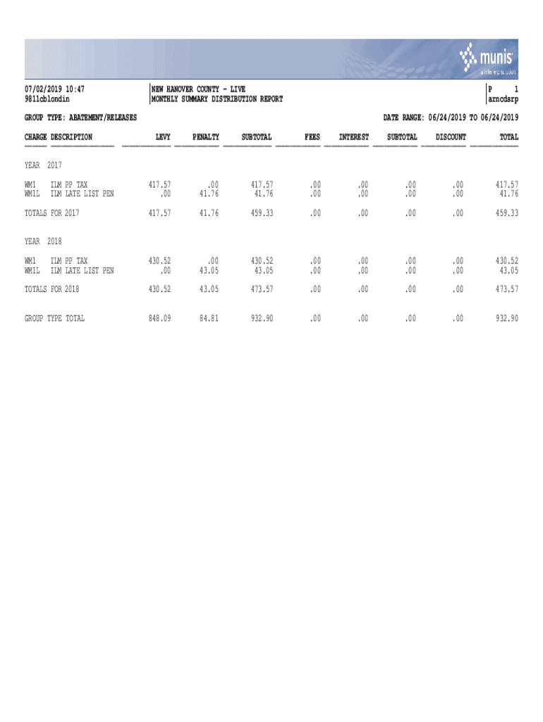 07/02/2019 10:47 9811cblondin|NEW HANOVER COUNTY LIVE |MONTHLY SUMMARY DISTRIBUTION REPORT|P 1 |arncdsrpGROUP TYPE: ABATEMENT/RELEASES CHARGE DESCRIPTION ___ ___ YEAR WM1 WM1LDATE RANGE: 06/24/2019