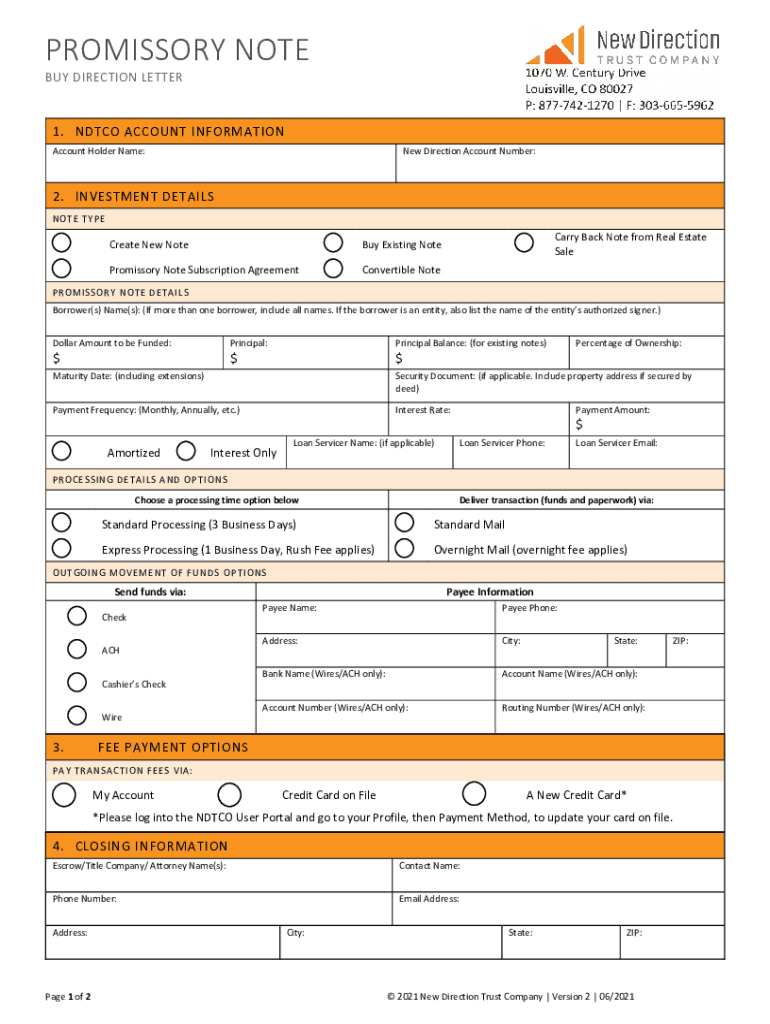 PROMISSORY NOTE BUY DIRECTION LETTER1. ND TCO ACCOUNT INFORMATION Account Holder Name:New Direction Account Number:2. INVESTMENT DETAILS NOTE Recreate New Notably Existing NotePromissory Note Subscription