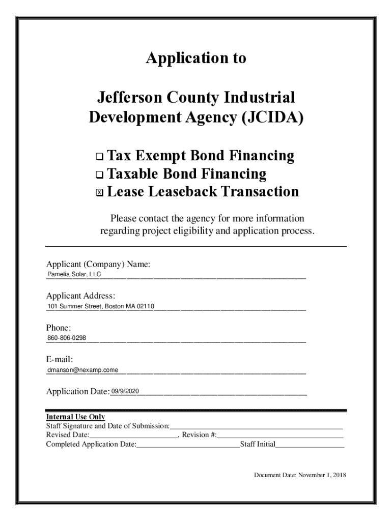 Application to Jefferson County Industrial Development Agency (ACID) q Tax-exempt Bond Financing q Taxable Bond Financing x Lease Leaseback Transaction q Please contact the agency for more information