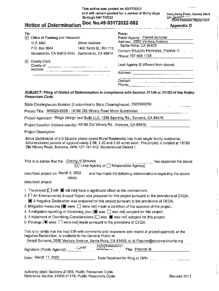 This notice was posted on 03/17/2022 and will remain posted for a period of thirty days through 04/17/2022Deva Marie Photo, County Clergy:Notice of Determination Doc No. 49 03172022 082 To:0Office