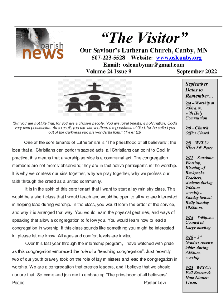 The Visitor Our Saviors Lutheran Church, Candy, MN 5072235528 Website: www.oslcanby.org Email: oslcanbymn@gmail.com Volume 24 Issue 9 September 2022 September Dates to Remember 9/4 Worship at 9:00