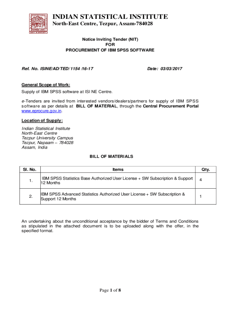 INDIAN STATISTICAL INSTITUTE NorthEast Center, Temper, Assam784028 Notice Inviting Tender (NIT) FOR PROCUREMENT OF IBM SPSS Software. No. SINE/AD/TED/ 1154 /1617Date: 03/03/2017General Scope of Work: