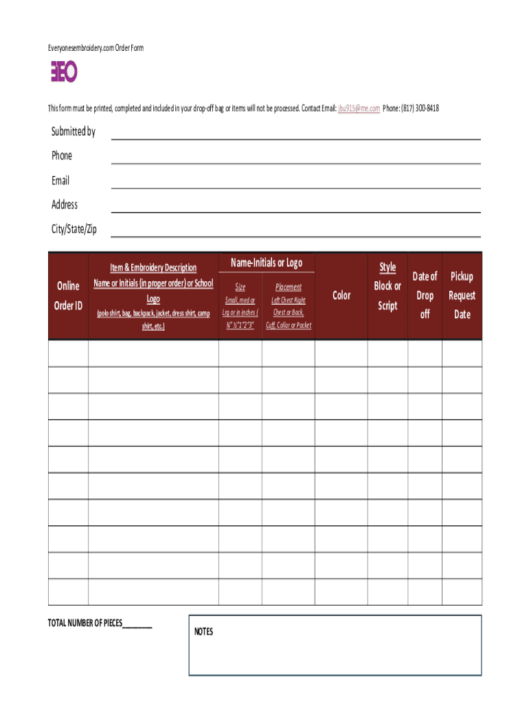 Everyonesembroidery.com Order Forms form must be printed, completed and included in your drop-off bag or items will not be processed. Contact Email: jbu915@me.com Phone: (817) 3008418Submitted by