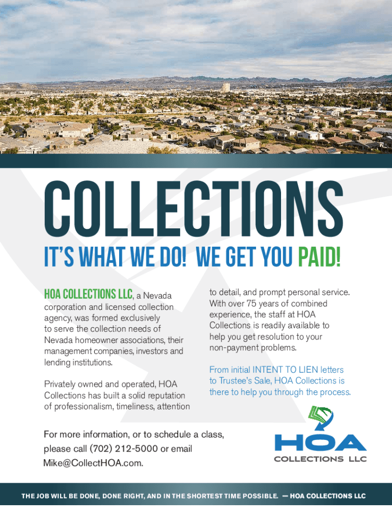 COLLECTIONS It's What We Do! We Get You Paid! HOA Collections LLC, a Nevada corporation and licensed collection agency, was formed exclusively to serve the collection needs of Nevada homeowner associations,